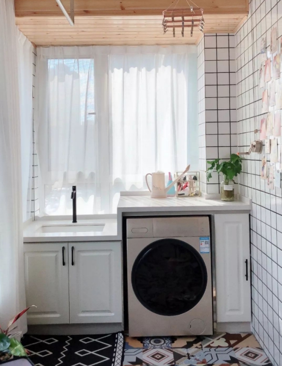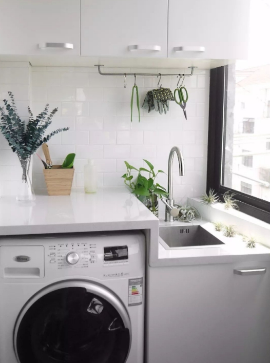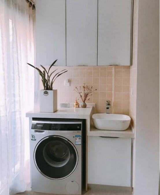 阳台洗衣机柜子也有搭配台盆的,那么就会涉及到台上盆和台下盆,台上盆安装简单,特别是那种方形的台上盆直接放在台面上就可以了,不过要注意尺寸,因为方形的台盆会突出来,那么在常规的尺寸柜子上安装可能就会高了,平时洗漱的时候就会不方便,支着个别洗东西时间上了就会很累。如果是安装台下盆那么就不会出现这种问题,尺寸根据主人的身高调整就可以,洗漱的时候水渍一抹就进入盆里,简单方便又使用。