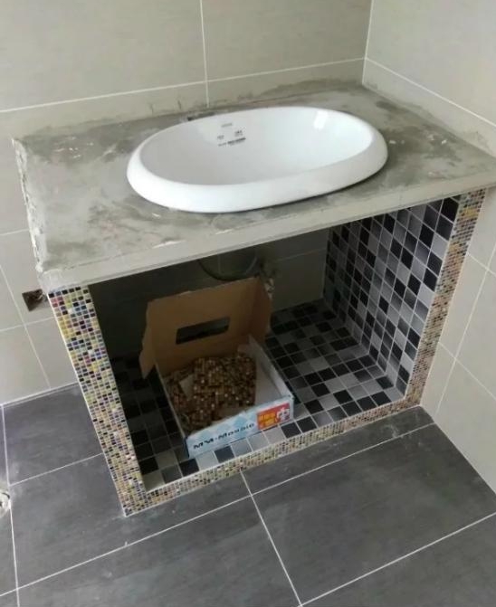 卫生间环境比较潮湿,如果是木质的橱柜很容易就出现返潮开裂腐烂的情况,那么就可以选择做砖夹橱柜,砖夹橱柜是用瓷砖水泥做成的,不用担心返潮发霉的情况,结实耐用还环保,喜欢的可以做一套。