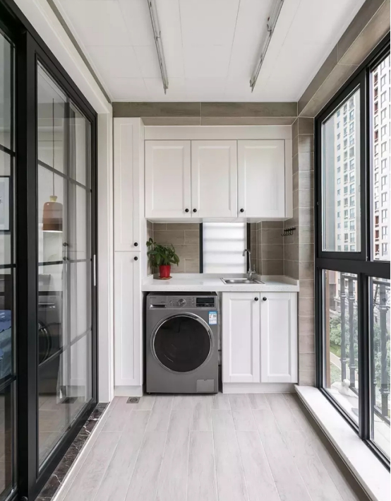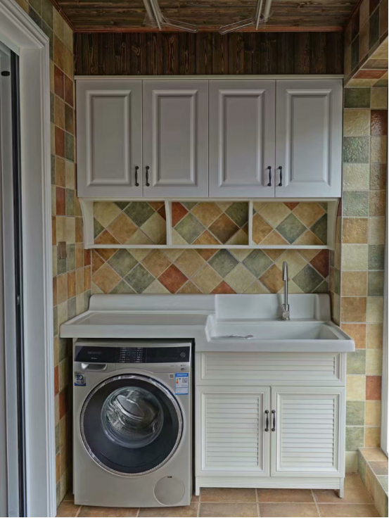 还有用的装修材料要结实牢固,地面铺瓷砖最好选择仿古砖,仿古砖有防滑的功能而且结实耐用还耐脏。吊顶做储物柜要用结实一些的木材,吊顶可以选择防腐木吊顶,如果洗衣机放阳台可以做一个砖砌洗衣机柜,这种橱柜用瓷砖水泥浇筑而成结实耐用,还能保护洗衣机不怕风吹日晒。