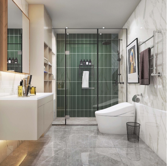 另外马桶可以采用壁挂式的,马桶的水箱是隐藏在墙体里面的,这样也可以节省空间,悬空的马桶不仅好看还没有卫生死角,打扫起来也是非常方便。