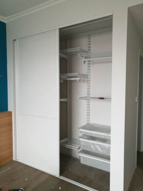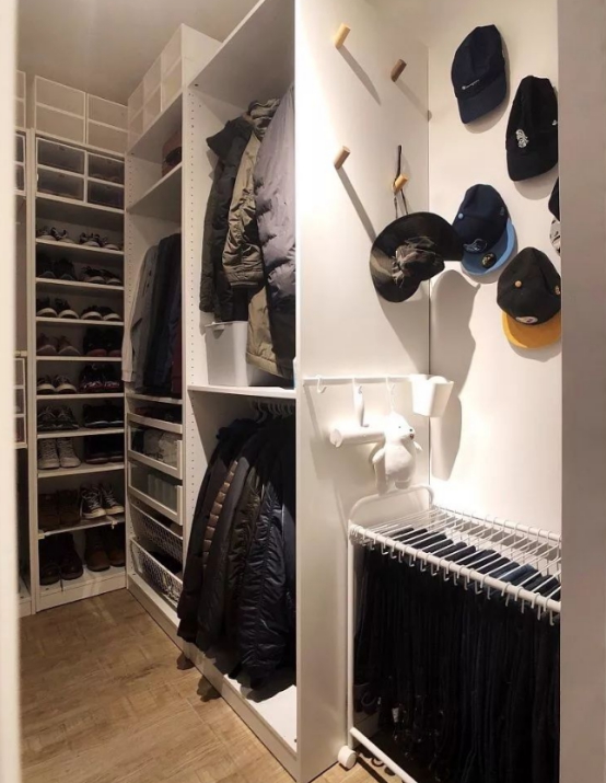 另外如果卧室空间有限,那么就可以利用衣柜改衣帽间,这样简易的布局,也可以做到衣帽间的功能,分类收纳即省空间又拿取方便。