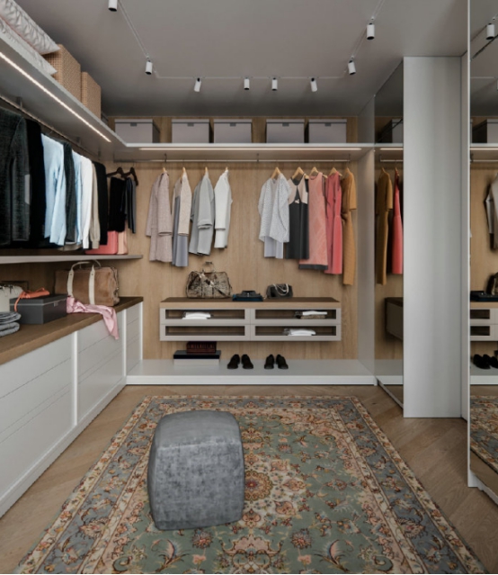衣帽间除了安装门可以防尘,另外也可以通过其他的方式让你衣帽间保持干净清爽。比如有的衣帽间会放地毯,那么地毯是很容易积灰的,所以尽量最好不要用这种材料,可以选择地板或者直接瓷砖就很不错,就算弄了一些污渍用水擦一下也没关系。另外如果是冬季干燥的季节,空间比较干燥也会起尘土,也要对衣帽间做加湿的处理,也能有效的防尘。