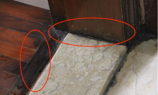 后期就找原因,忽然就发现了。原来是所有的被淹的地方全是因为做了地暖,做地暖下面有一层那个薄的垫子,这个垫子它是一个连贯的铺过来的。那么当我们把上面过门石处理的再严实,水是从那个垫子往里洇。这个也就是我们当时发现的,后来我们也完美的想到了办法把它处理掉。