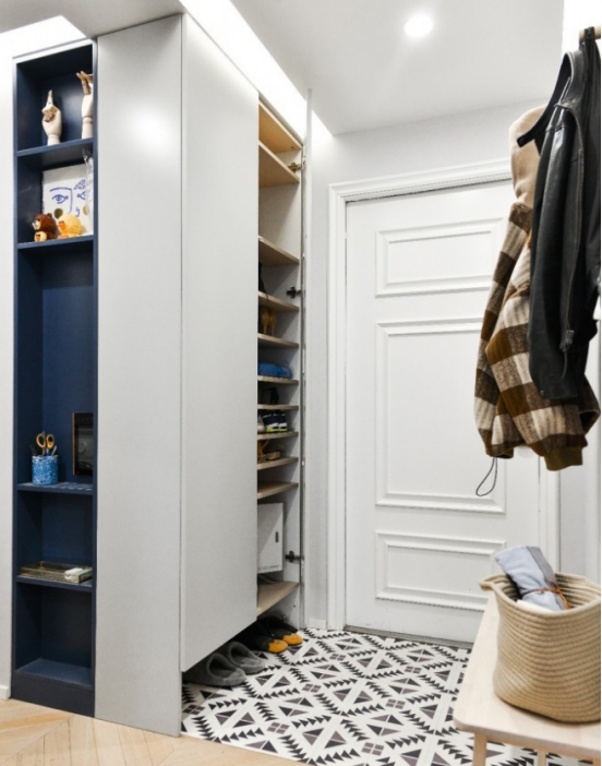 比如玄关的空间,可以利用墙体做嵌入式的鞋柜,或者是把墙体拆除做一个简单鞋柜隔断也是很不错的,视觉上会宽阔。