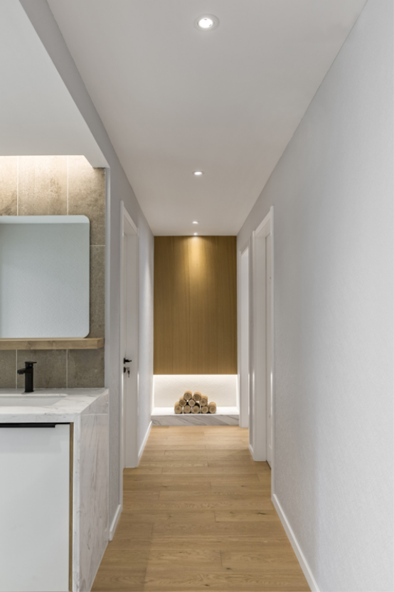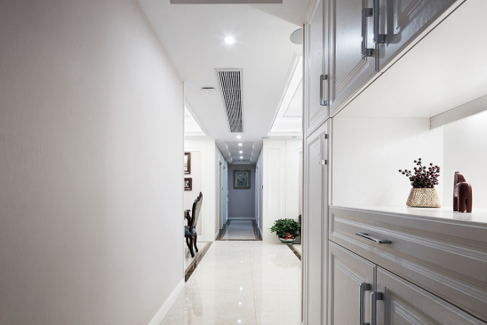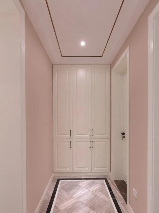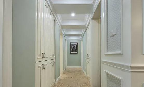 除了在墙面可以做内嵌的柜子,一般在走廊的尽头也可以做一些储物柜,这样看上去进深不长,缩短了走廊的距离,从整体感上来说会更协调,另外储物功能也很强,不用担心家里的一些东西没地方放了。