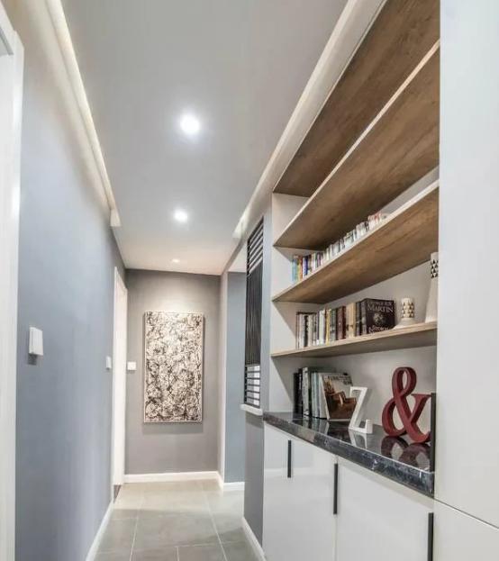 首先这样的过道,很多人是用来装饰的,其实也可以作为储物的空间来布局,比如可以做一些内嵌的柜子,可以放很多东西,像是一些不常用的衣物玩具等,就可以收纳在这里。整体装饰感也很不错,不仅能储物还有起到装饰的作用。