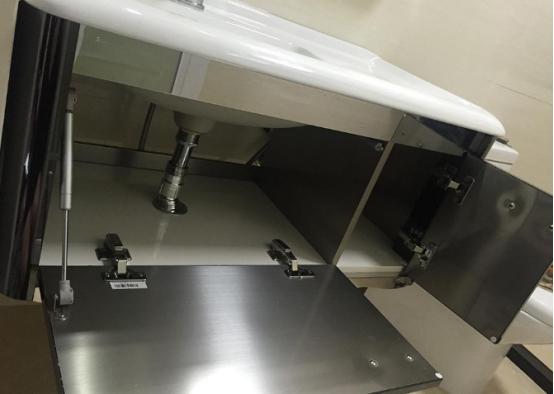 浴室柜我们常见的就是木质的,也是比较便宜的一种橱柜了,简单一点的就是用木材做一个框架,把洗手台放上去就可以了。所以关键是木材了,一般便宜是贴皮的颗粒板,就是用锯末加胶水压制而成的木材,这种木材握钉能力差,一般出现问题的就是,柜门铰链处钉子松动,因为这种木材本身比较松软,怎么加固都没有用,基本用个一两年门子就掉了。另外一个就是不防潮,有一点水进入那么就很快的产生霉变,造成腐烂的情况。严重的可能会长出蘑菇!