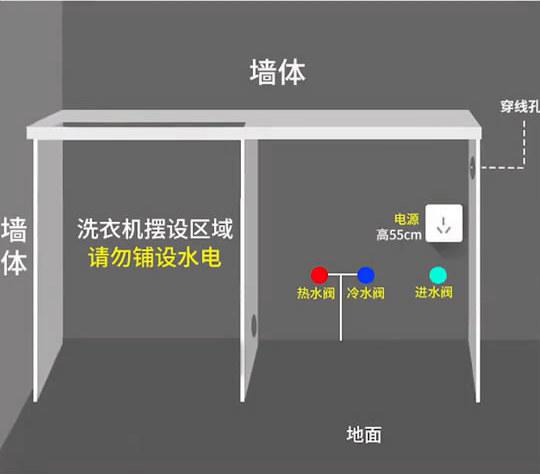 还有就是电路要预留,在水电施工的要给洗衣机预留好插座。需要注意的是,如果买的是滚筒洗衣机插座最好不要放在洗衣机后面,这样会导致洗衣机不能靠墙放,正确的做饭是放在洗手台的这边的空间,这样看上去更美观也不浪费空间。