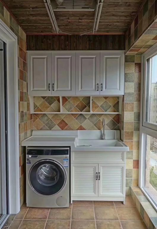 除了注意水电要布局到位,还有比较重要的地方,那就是洗衣机柜的材质,洗衣柜体是要支撑洗手台的,所以要选择结实耐用的材质。很多人会用买的木质的柜子,这样使用了不多久就会出现返潮变形的情况,另外阳台风吹日晒环境木质很快就会坏掉。
