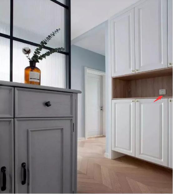 先从玄关说起,玄关鞋柜一般是留空的,这个地方最好预留一个插座,可以方便我们下班把随手放在这里充电,上班直接就可以拿走了。除了给手机充电,还可以给一项小的电器充电。另外如果是智能鞋柜,是带有除臭杀菌烘干的功能的,这样就要在玄关处预留一个插座了。