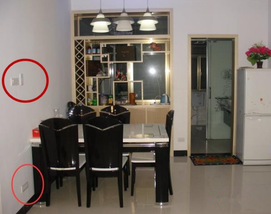 餐厅的开关单控的控制就可以,餐桌墙面下方预留两个五孔插座,有些人不喜欢地插,觉得比较麻烦还有安全隐患,安装在墙角,就可以代替地插。