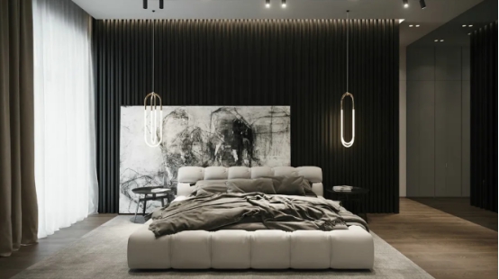 1、卧室不要安装大吊灯,因为安装会在床的上方,会压低层高有压抑感,其实我们可以选择普通吸顶灯或者做一下无主灯的设计,这样简单时尚还美观。卧室是我们休息睡觉的地方,灯具不要太明亮,局部用筒灯或者隐藏光,3000k的暖色的色温就足够了。