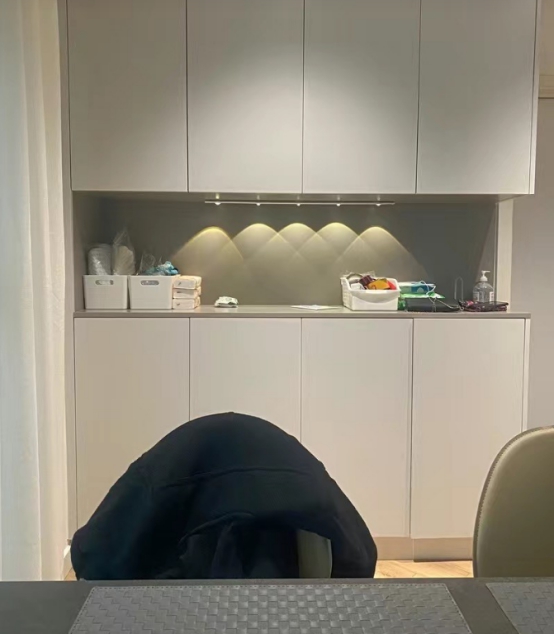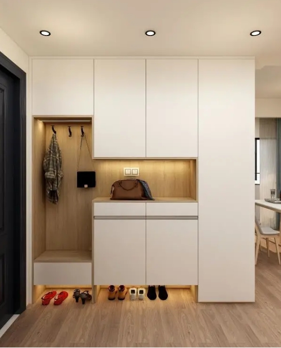 5、鞋柜一定要做上下分体,中间预留20公分,我们下班回来就可以把一些帽子,钥匙,快递放在这里,如果采光不好的,还可以安嵌入式灯条,这样寻找东西更方便。