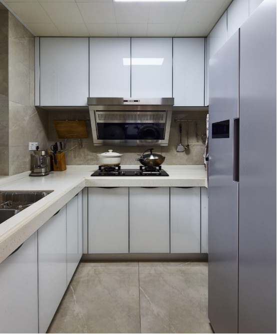 6、厨房如果要安装推拉门,最好不要选择地轨推拉方式,这种轨道容易藏灰,不容易清理,可以选上吊柜的,这样整体性更美观,清理起来更方便。