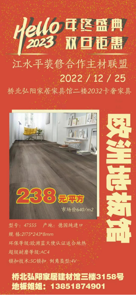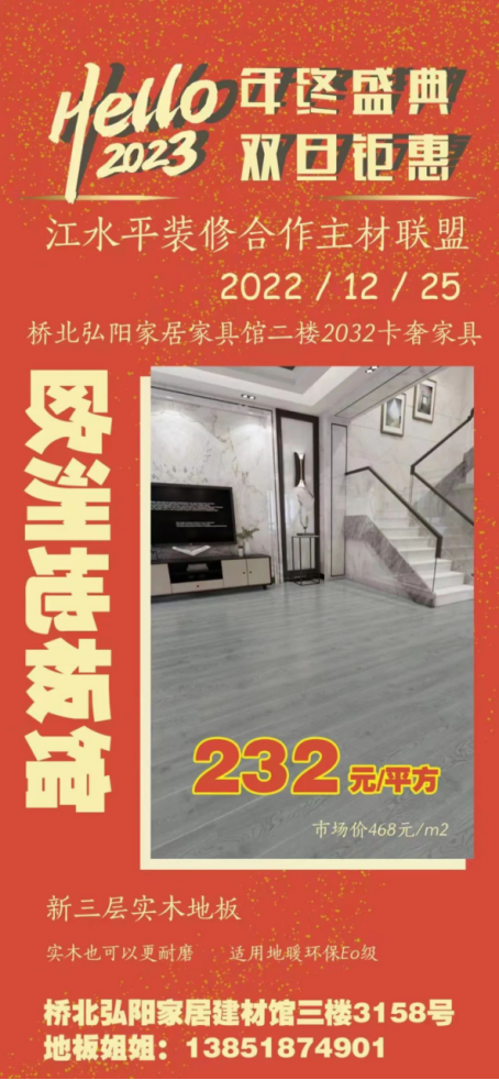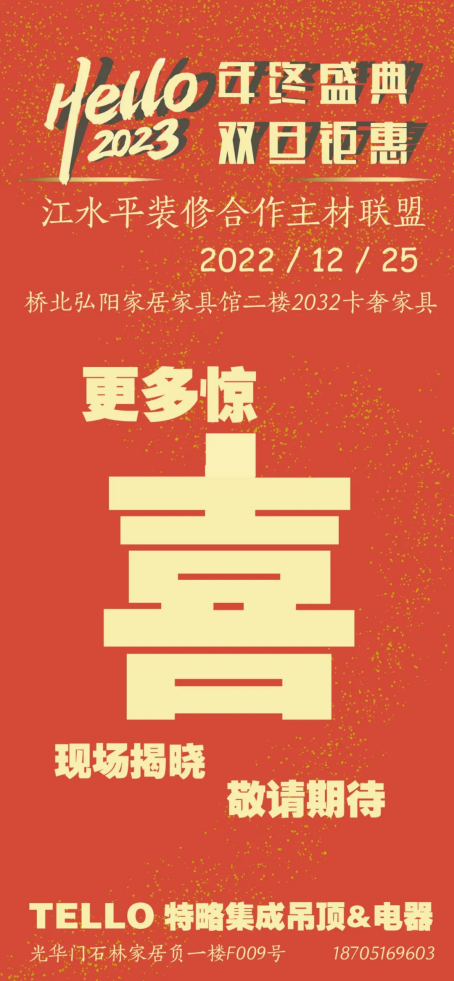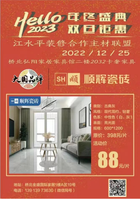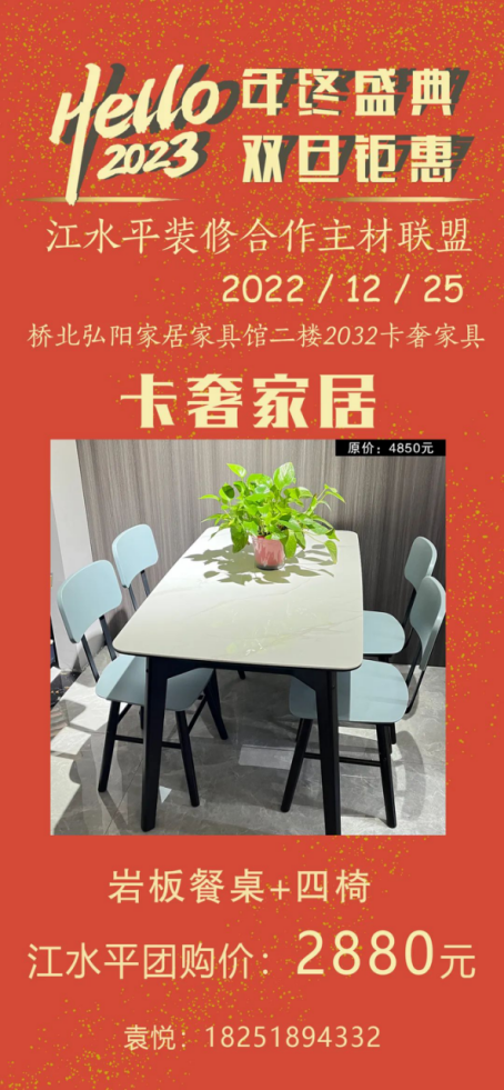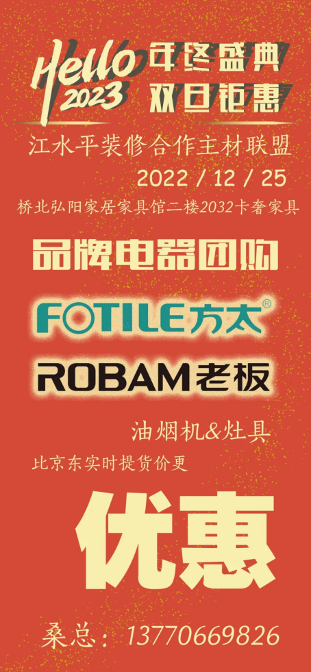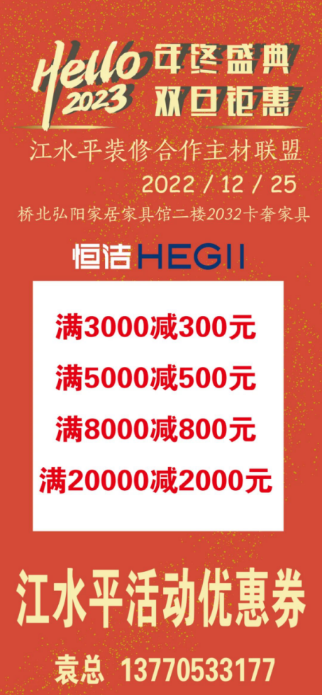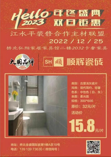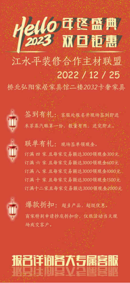 江水平主材联盟的商家们特地给装修的朋友们向工厂申请了抄底福利价,将在2022年12月25日(周日)的团购会上回馈所有对我们信任和支持的好朋友们!