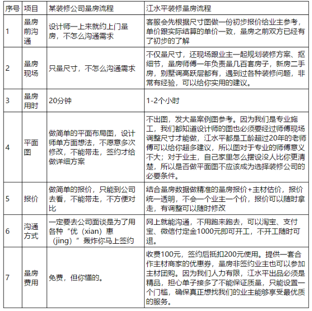 现在一些装修公司为了拉客户,免费量房出效果图,很多业主为了这个免费的果子,多方对比最后看花了眼,稀里糊涂的签了约付了60%的工程款,忘记了装修要把主动权掌握在自己手里。其实仔细想想,天底下没有免费的午餐,量房人员难道不需要发工资吗?设计师免费做的图真是你想要的效果吗?下面的某装修公司量房流程是经业主口述,我们做了一个对比,大家一目了然江水平为什么量房要收费。