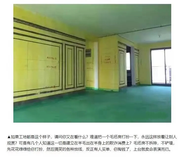 墙上画的叫大样图,一套下来5000起步,而且将来乳胶漆刷上,啥都看不见了。墙上黄色地方是强固,1000-2000元起步,大房子更多。胶水掺点颜料刷墙上,美其名曰防止施工时候粉尘和墙体碎末;如果水泥粉刷不过关,刷这个是管不了事的,刷完这道胶,批腻子之前还要刷一道,因为那道胶才是必不可少的。等于是白白多花一千块还给家里多了一遍有环保隐患的胶水。