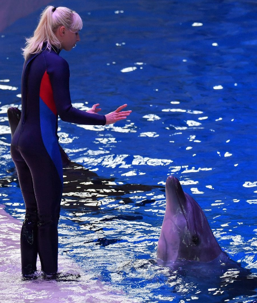 好多人看过海豚表演,海豚在音乐声中纵深一跃,嘴尖够到了空中高挂的绣球,然后游到岸边,伸出尖尖嘴,驯兽员抓一把鱼干,塞到海豚嘴里,轻拍一下它的头,海豚潜入水中,再去完成下一套动作。