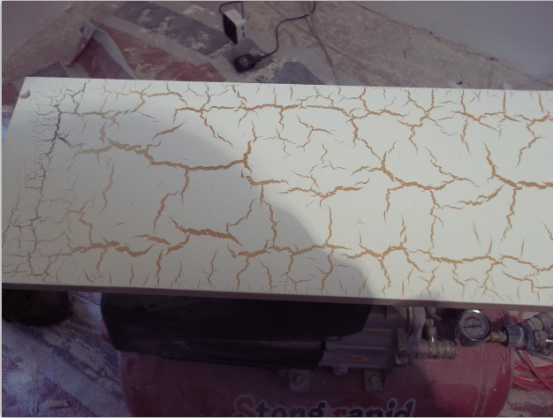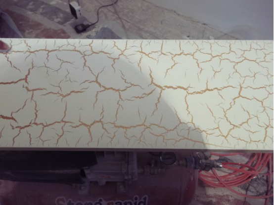 c、施工裂纹漆:把配制好的裂纹漆施工在已喷涂好底漆的基面上均匀喷涂1道,大约30-50分钟左右,由于收缩剂的收缩作用即可自行产生裂纹效果,在美丽的裂纹下面,露出底色漆的颜色。如果裂纹漆与底漆配合得协调,则可以得到很好的花纹和色彩,喷涂裂纹面漆时,须在底漆干燥后施工(一般25℃,6小时以上),否则会影响裂纹。最后再用半亚光、哑光清面漆或双组份PU光油在裂纹漆表面罩面。大面积施工前必须先在已喷涂底漆的小样板上喷涂试样,根据裂纹大小的效果,选择好裂纹面漆的施工粘度、漆膜的厚度,调节好喷枪的形状、气压、出漆量(定型)。裂纹面漆粘度大、漆膜厚则裂纹速度慢,裂纹纹理大;反之,裂纹速度快、裂纹纹理小。裂纹面漆喷涂必须均匀,否则就产生裂纹大小不匀的效果。如施工后裂纹效果不佳可直接在面漆上重涂底漆(须在清漆罩面工序前),重涂底漆方法同前。