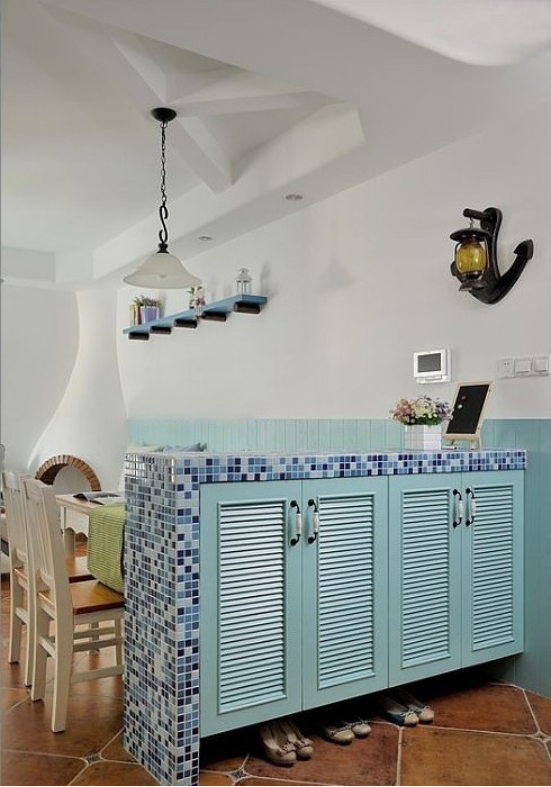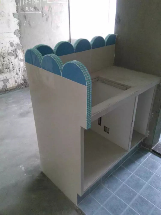 砖砌橱柜的柜体和台面都是瓷砖的,不怕水,脏了可以直接用水冲,用刷子刷,油垢厚了甚至可以上刀子铲,冲洗完用抹布擦干又是Bling~Bling~闪亮亮~~,试想如果柜体是木质的,能用水冲用刷子刷吗?木质的能上刀子吗?当然上刀子是夸张的啦~不过这也正说明了砖砌橱柜防水好打理。
