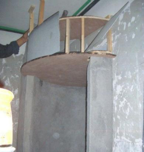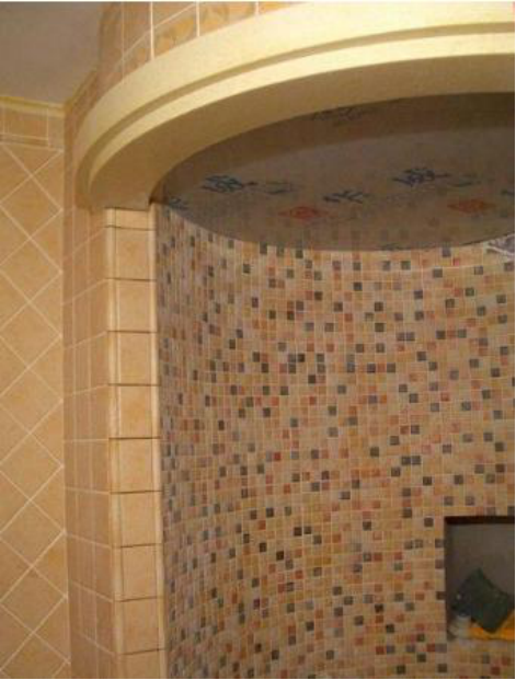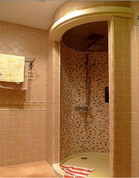 淋浴房在圆弧中间,做了一个壁龛。这个以后可以放一些必要的洗涤用品,这样还顺手。